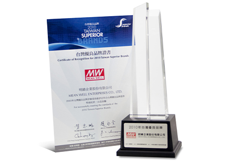 2010年,明緯榮獲經(jīng)濟(jì)部國際貿(mào)易發(fā)展局頒發(fā)「2010臺(tái)灣優(yōu)良品牌獎(jiǎng)」,創(chuàng)辦人林國棟先生代表明緯集團(tuán)領(lǐng)獎(jiǎng),此獎(jiǎng)肯定明緯長期深耕自有品牌的努力與成果。