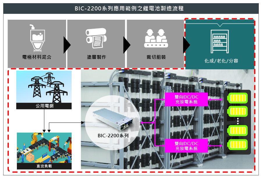 如下圖所示,電池生產(chǎn),從電極制作開始一直到出貨期間,部分制程需透過電池的充放電,以確保電池的功能與效能。所有制程中,以「化成」與「老化&分容」這兩大制程耗能最巨,其中「化成」更是影響電池質(zhì)量的關(guān)鍵制程之一。在過去,電池生產(chǎn)線需采用一臺充電器搭配一臺逆變器,方能實現(xiàn)「化成」與「分容」兩個制程。此作法不僅占據(jù)較大的空間,整體成本也無法有效下降;越多原件也意味著維護成本升高,信賴度大幅降低。