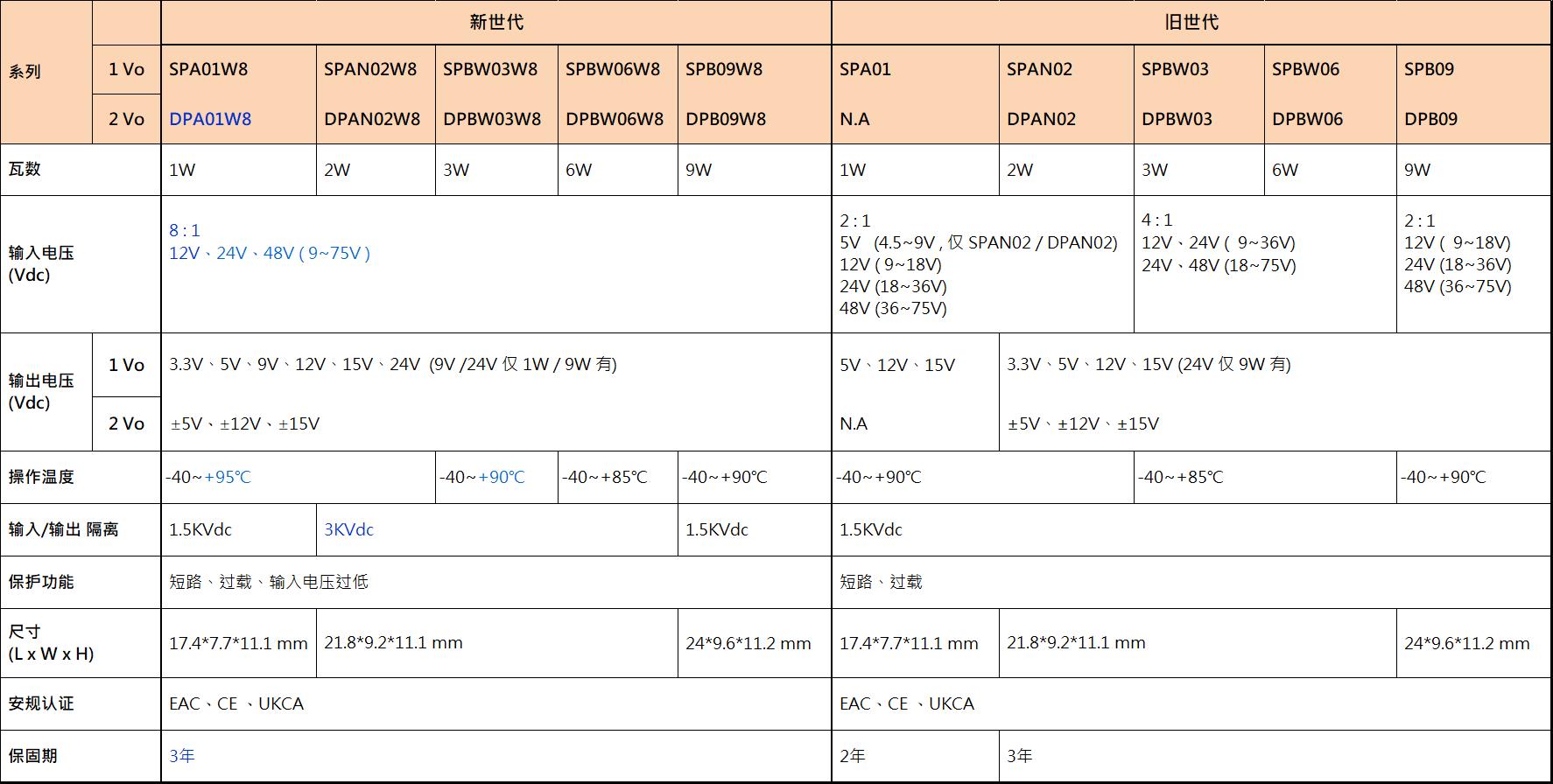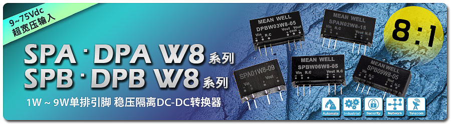 明緯 DC-DC 模塊型單組輸出 SPA01 / SPAN02 / SPBW03 / SPBW06 / SPB09 及雙組輸出 DPAN02 / DPBW03 / DPBW06 / DPB09 SIP 單排引腳封裝 1~9W 2:1 及 4:1 輸入機型上市多年,年銷數(shù)十萬臺,廣泛應(yīng)用于電力、電子儀表、通信設(shè)備、工業(yè)自動化控制、IoT…等, 新上市超寬壓輸入單組輸出 SPA01W8 / SPAN02W8 / SPBW03W8 / SPBW06W8 / SPB09W8 及雙組輸出 DPA01W8 / DPAN02W8 / DPBW03W8 / DPBW06W8 / DPB09W8 等 5 系列,最大亮點為 8:1(9~75Vdc)超寬壓輸入范圍,不僅可滿足更寬輸入電壓需求,更因輸入范圍統(tǒng)一為 9~75Vdc,機型選擇大幅簡化,讓選型變得更容易。新品 5 系列引腳與舊品兼容,可讓終端設(shè)備設(shè)計者以新代舊無痛替換,新 vs 舊世代主要特點及規(guī)格差異請參考下表: