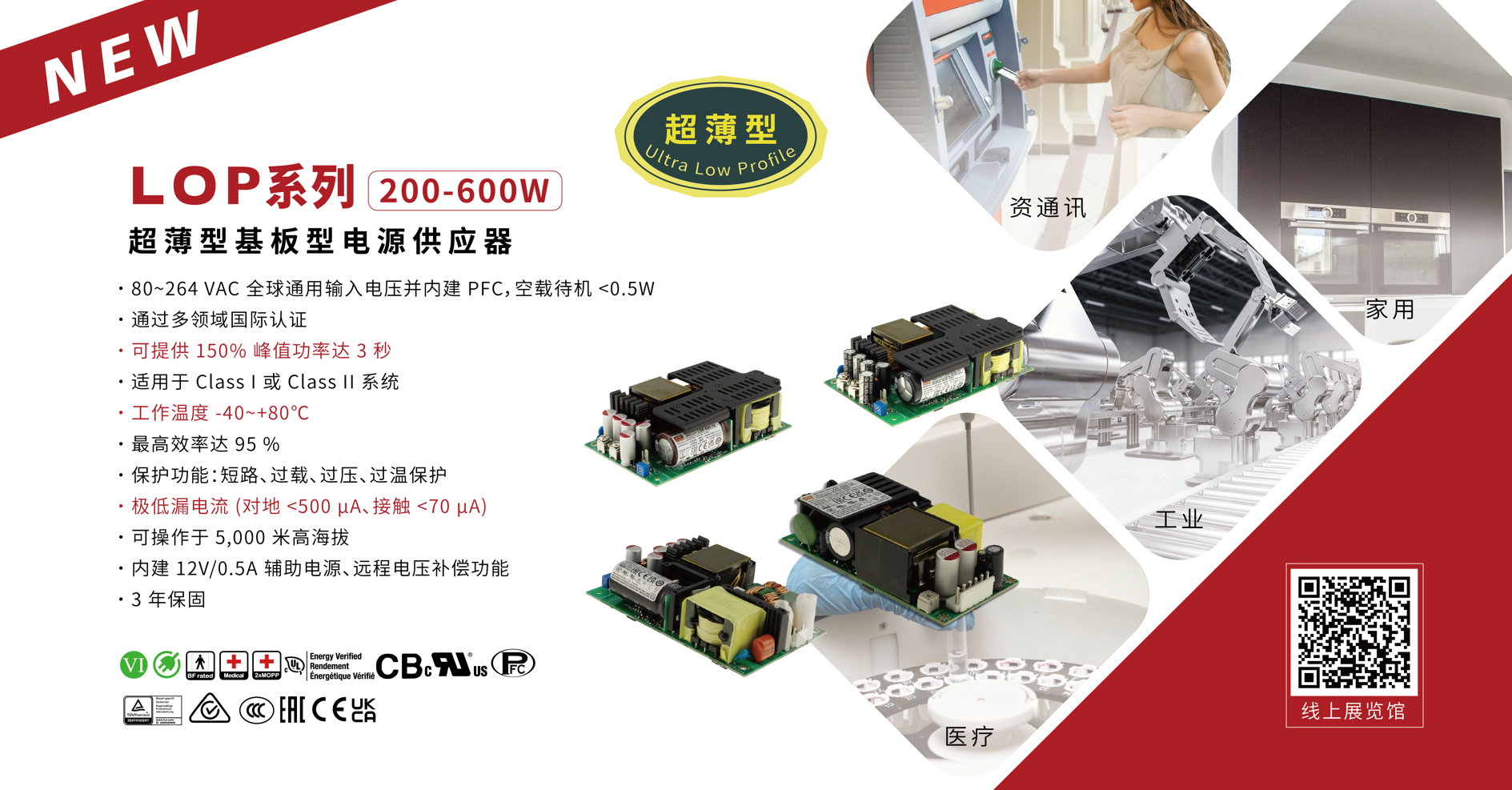 明緯超薄基板型LOP系列,功率涵蓋200~600W,5" x 3" 尺寸下功率可至 600W、具備 150% @ 3 秒供載能力、-40~+80℃更寬工作溫度,同樣通過多領域國際認證,適用于資通訊、醫(yī)療、工業(yè)、家居行業(yè)。