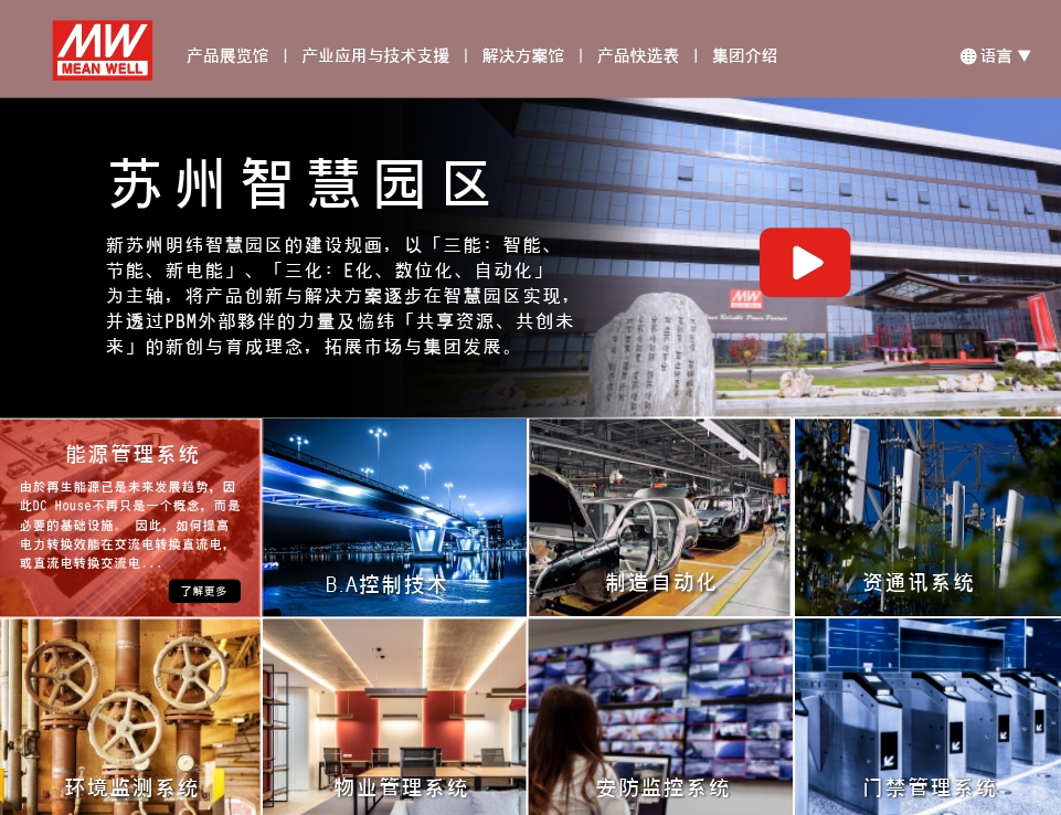 甫于2022/11/10全新開幕啟用的蘇州明緯智能園區(qū),以明緯集團(tuán)推廣「三能:智能、節(jié)能、新電能」、「三化:E化、數(shù)字化、自動(dòng)化」為主軸,實(shí)現(xiàn)產(chǎn)品創(chuàng)新與解決方案的應(yīng)用園區(qū)。誠摯的邀請您參觀園區(qū)內(nèi)的八大系統(tǒng)科技應(yīng)用,您將了解標(biāo)準(zhǔn)電源于各產(chǎn)業(yè)應(yīng)用息息相關(guān)的明緯,所提供各式豐富的解決方案。
