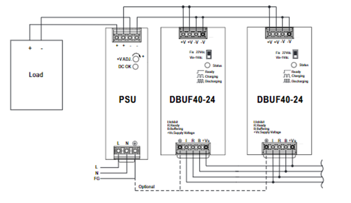 緩沖模組與不斷電系統(tǒng)有諸多差異,如表一。由于緩沖模組內(nèi)部是由電容組成,因此,有著小型化、低成本且免維護(hù)等優(yōu)點。此外,UPS有毫秒級的反應(yīng)時間,相較之下,緩沖模組則無此問題。緩沖模組內(nèi)部電容與電源輸出端采直接并聯(lián)的形式如圖三,當(dāng)電源輸出失效時,緩沖模組內(nèi)的電容可即時供電,讓客戶有足夠時間進(jìn)行資料儲存。緩沖模組特別適用在資料處理相關(guān)設(shè)備,或者工業(yè)電腦供電設(shè)備。倘若終端設(shè)備負(fù)載量較大,或需較多時間儲存資料時,緩沖模組亦能并聯(lián)使用,如圖四。