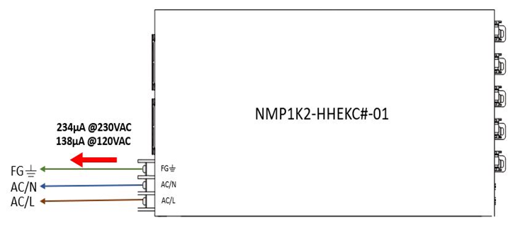 圖1顯示了明緯單臺模塊電源產(chǎn)品 NMP1K2-HHEKC#-01的漏電流測試結(jié)果,該機型由24V,12V,48V和5V四個輸出模塊組成。