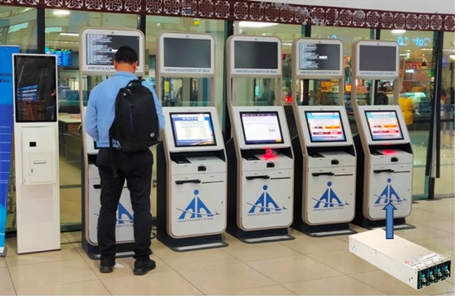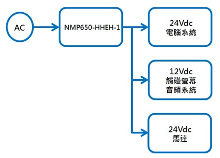 下圖為機場自助登機臺的設(shè)備,內(nèi)部使用一臺模塊電源NMP650-HHEH-1,其中SLOT1/2為24Vdc并聯(lián)供電給內(nèi)部搭載的計算機系統(tǒng),SLOT3為12Vdc供電給觸碰屏幕與音頻系統(tǒng),SLOT4為24Vdc供電給馬達。
