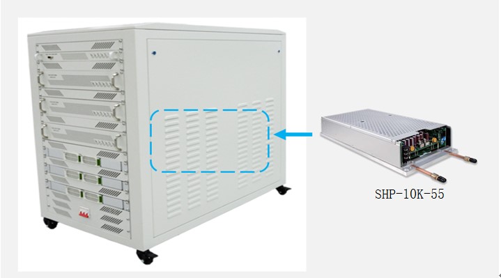 如圖三是將SHP-10K-55安裝在固態(tài)微波源的設(shè)備內(nèi),提供非常穩(wěn)定的直流電壓能量給功率級微波能量線路,系統(tǒng)提供可控且精準(zhǔn)的微波能量給相關(guān)設(shè)備使用,如工業(yè)微波加熱設(shè)備、工業(yè)微波干燥設(shè)備、微波等離子體設(shè)備等。