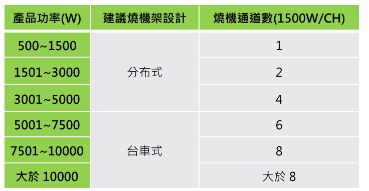 表2是根據(jù)電源產(chǎn)品的瓦數(shù)大小,提供合適的燒機架與ERG-5000通道數(shù)的建議。