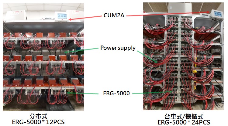 圖二是針對明緯不同的電源產(chǎn)品設(shè)計的燒機架,左邊分布式燒機架適用小于5000W的電源產(chǎn)品;右邊臺車式燒機架適用大于5000W的電源產(chǎn)品。