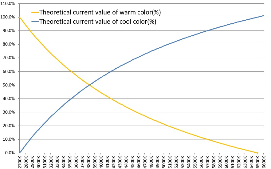 可調色溫和亮度的LED燈具,內部是采用了冷、暖色溫兩路光源輸出,如下圖三,一路為冷光(6500K),一路為暖光(2700K),每一路相對獨立。如下圖四,透過調設每一路光源驅動電流的比例,可以實現(xiàn)色溫調設;在一定色溫條件下,同比例改變兩路光源驅動電流的大小,可以實現(xiàn)亮度調設。