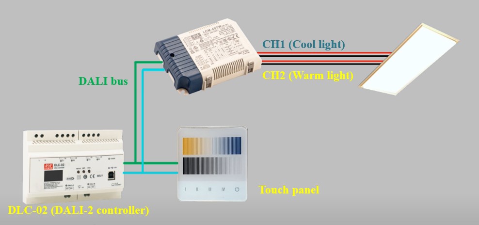 為滿足市場應用需求,明緯最新推出一款符合DALI-2的LCM-40TW可調色溫和亮度的智能電源,結合明緯DLC-02 DALI-2控制器,搭配DALI-2輸入設備(如觸摸面板、存在傳感器等),為室內智能照明系統(tǒng)提供最佳解決方案,如下圖五為DALI-2智能照明配置圖。