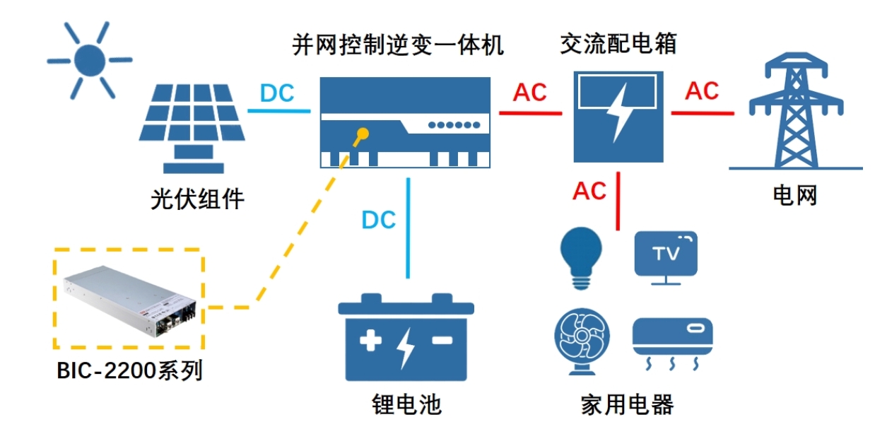 家用儲(chǔ)能系統(tǒng)(如圖2..),主要包括光伏組件、鋰電池、并網(wǎng)控制逆變一體機(jī)和家用電器等。在夜間把電力系統(tǒng)的低價(jià)電力,通過一體機(jī)內(nèi)部的BIC-2200對(duì)鋰電池充電儲(chǔ)能;在白天電網(wǎng)高負(fù)荷的時(shí)候,鋰電池再經(jīng)BIC-2200反向輸出能量并回饋至電力系統(tǒng),不僅可以削峰填谷,減輕電網(wǎng)波動(dòng),還能為家庭節(jié)省電力開支。