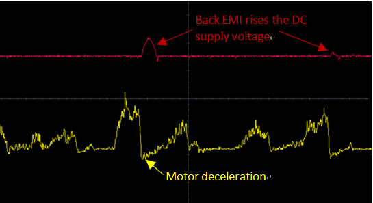 當使用直流電壓為馬達(尤其是伺服馬達)供電時,馬達在減速過程中通常會產(chǎn)生反電動勢。這將造成反向電流而饋回直流電源電壓,并對直流電源輸出電容器組充電。因此,在反向電流對電容器組充滿電后,直流電源電壓將觸發(fā)過電壓保護功能。圖1描述了馬達減速期間直流電源電壓的上升現(xiàn)象。