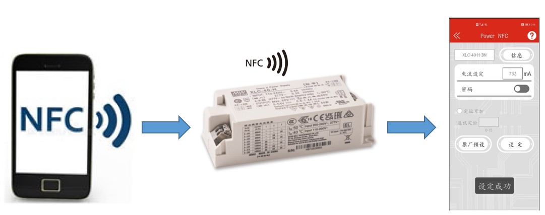 LED照明燈具的規(guī)格多樣化,LED驅(qū)動電源制造商一般采用硬件方式改變電流偵測線路基準(zhǔn)電壓值的方法(用戶以指撥開關(guān)或可變電阻等方式)來設(shè)定電流需求,但這兩個方式都較無法細(xì)微且直覺式的調(diào)整電流,為了滿足有精準(zhǔn)且快速設(shè)定電流需求的客戶,明緯產(chǎn)品結(jié)合NFC近場通訊技術(shù),提出智能無線編程解決方案。