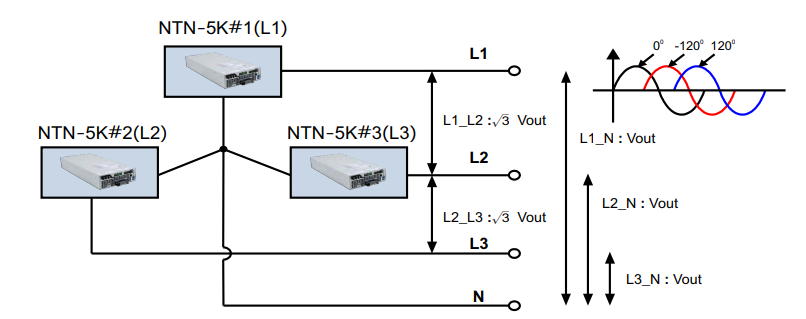 明緯新推出的 NTN-5K 是一款 5000W 高可靠離網(wǎng)正弦波的 DC-AC 逆變器,內(nèi)建交流充電器和 UPS 功能 (交流旁路)。搭配電池適用于住宅、商業(yè)、船舶、汽車、礦山、建筑工地與沒有市電的偏遠地區(qū)。除了可單相使用外,也可以使用 3 臺并按照以下的配接方式組成三相四線式電源,應用于三相四線 (L1/L2/L3/N) 設備或分別配接相電壓 (L1/L2/L3-N) 于單相設備。