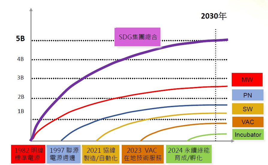2020年12月12日,明緯第一本專書「信賴伙伴的力量」新書發(fā)表會(huì)上,SDG集團(tuán)創(chuàng)辦人林國棟先生首度公開提出成立「SDG集團(tuán)」的想法,SDG集團(tuán)由經(jīng)歷近40年耕耘的明緯集團(tuán)為基礎(chǔ),并以明緯公益基金會(huì)作為價(jià)值核心,發(fā)展第二品牌聯(lián)源集團(tuán),投資外部合作伙伴并輔導(dǎo)成為 ESG 企業(yè),作為明緯集團(tuán)經(jīng)銷商販賣上下游產(chǎn)業(yè)產(chǎn)品,以進(jìn)出口貿(mào)易型態(tài),整合資源取得最佳性價(jià)比商品,透過全球通路與分公司銷售 ;協(xié)緯集團(tuán)則著重中國地區(qū)發(fā)展,各子公司間互相支持產(chǎn)生綜效,并以蘇州智能園區(qū)為基地,負(fù)責(zé)生產(chǎn)與制造高性價(jià)比標(biāo)準(zhǔn)產(chǎn)品,提供SDG 集團(tuán)內(nèi)部企業(yè)與伙伴使用或外部銷售為主 。